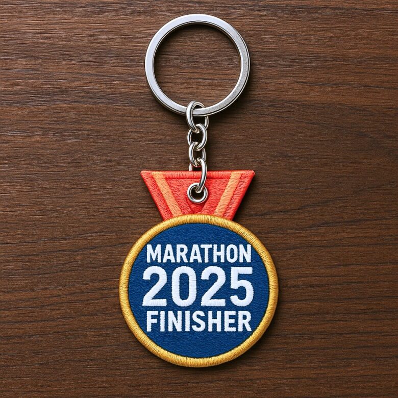 メダル風の刺繍ワッペンキーホルダーに、チーム名や大会名を入れて、